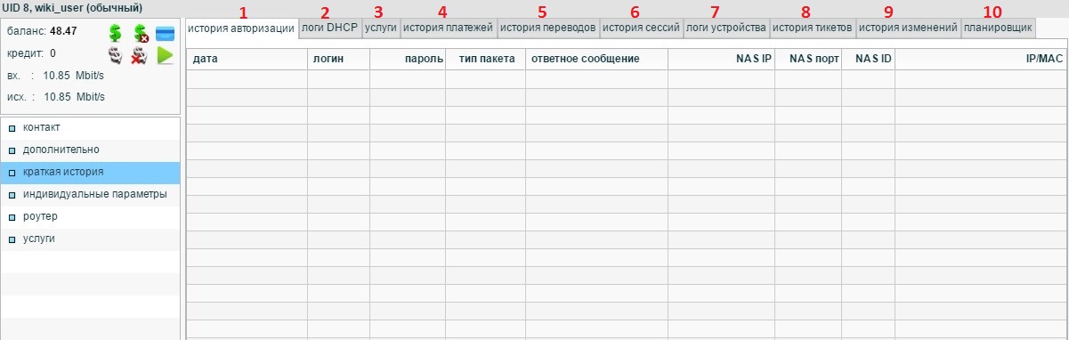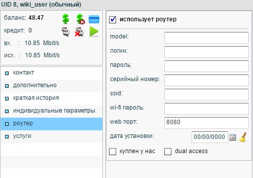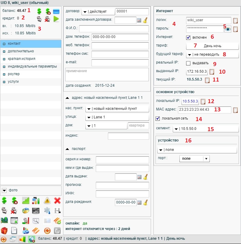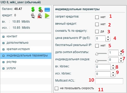 6. Разрешает/Запрещает абоненту доступ в интернет. Выключенная галочка = абонент должник.