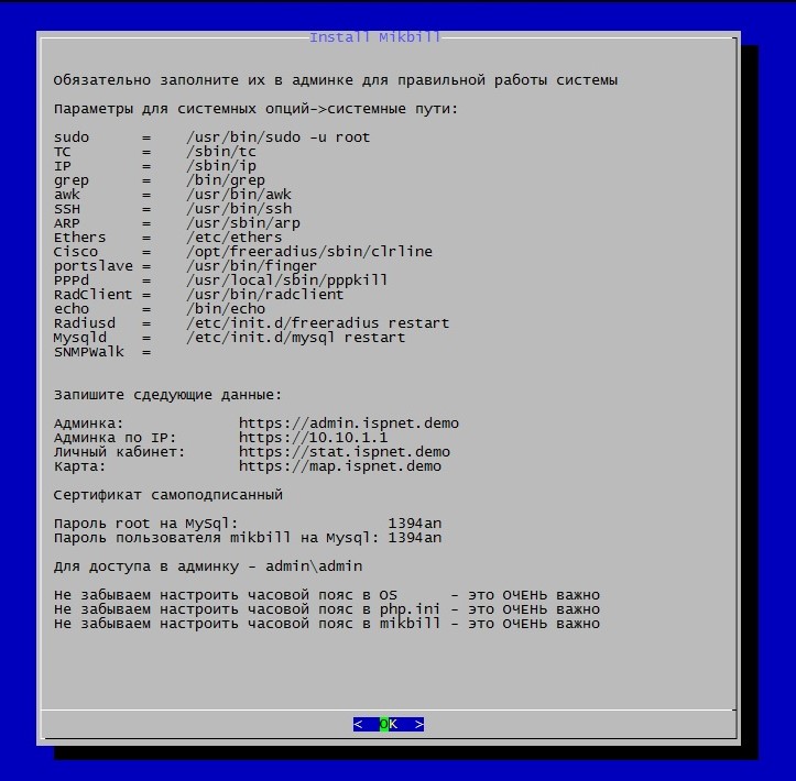 4. "MYSQL - mikbill password:" - Пароль пользователя mikbill для MYSQL.