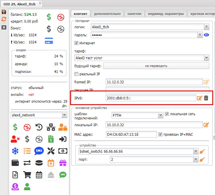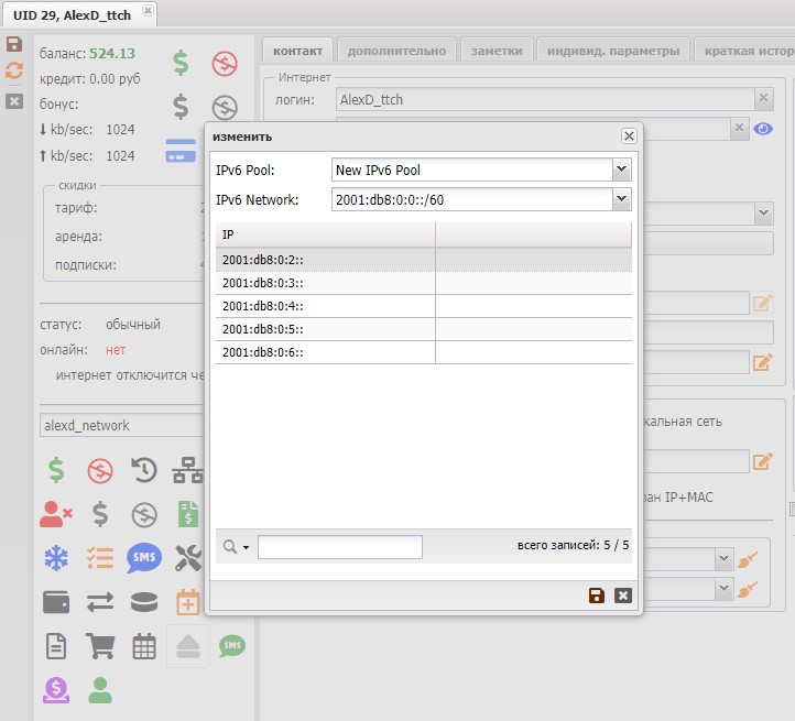 После выбора IPv6 адреса, он закрепится за абонентом в его карте.
