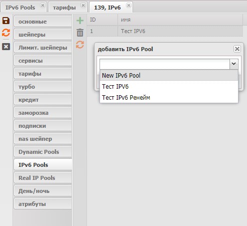 Для добавления IPv6 пула на тариф, нужно в свойстве тарифа на вкладке IPv6 Pools нажать