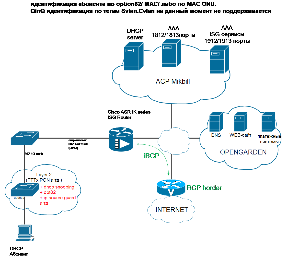 В данной статье приведен пример интеграции биллинга Mikbill c маршрутизатором Cisco ASR1k для предоставления услуг доступа в интернет на базе модели IPoE и технологии Cisco ISG с идентификацией клиента по порту (opt82). Ниже изложенный материал не является единственным возможным решением одной и той же задачи и не претендует на абсолютную верность. Практически по каждой команде в конфигурации Cisco ASR1k, есть возможность настроить поведение системы “под себя” c учетом тех или иных особенностей сети оператора связи.Автор этих строк не является техническим писателем, поэтому заранее просьба извинить за стиль изложения.