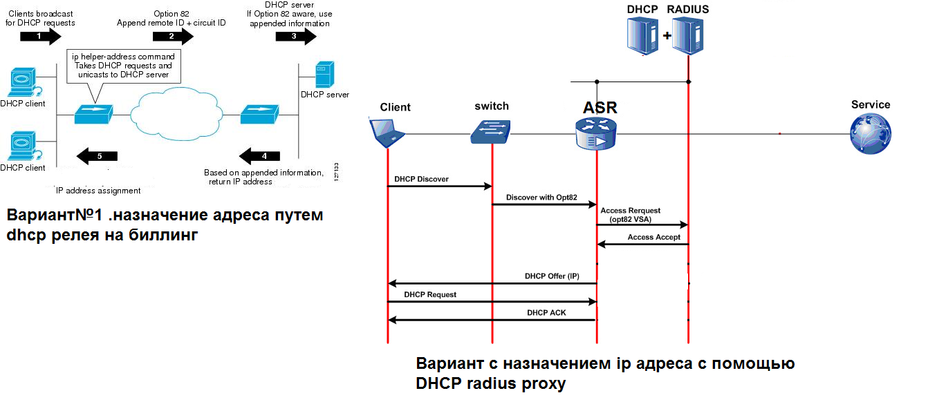 - Cisco ASR релеит DHCP запрос на биллинг, (тут есть два варианта). Вариант№1: Релей стандартными средствами через ip helper-address a.b.c.d на интерфейсе смотрящем в сторону клиентов с сохранением данных опции82, либо Вариант №2: с помощью механизма DHCP Radius Proxy в котором DHCP Discover пакет преобразуется в Radius Access-Request на получение адреса. Более подробно тут: http://www.cisco.com/c/en/us/td/docs/ios-xml/ios/ipaddr_dhcp/configuration/xe-3s/dhcp-xe-3s-book/dhcp-serv-rad-proxy-xe.html
