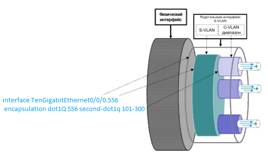 ! interface TenGigabitEthernet0/0/0.556 encapsulation dot1Q 556 second-dot1q 101-300 ip unnumbered Loopback1 ip helper-address a.b.c.d (релей на биллинг) ip nat inside service-policy type control IPOE_CUSTOMERS (управляющая политика) ip subscriber routed initiator unclassified ip-address ipv4 !
