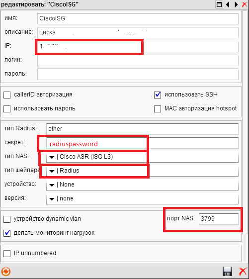 Настройка NAS в биллинге достаточно проста.Создаем новый NAS и указываем ему тип. И придумаваем radiuspassword. Порт3799 используется для отправки COA и динамического навешивания сервисов на абонентскую сессию.