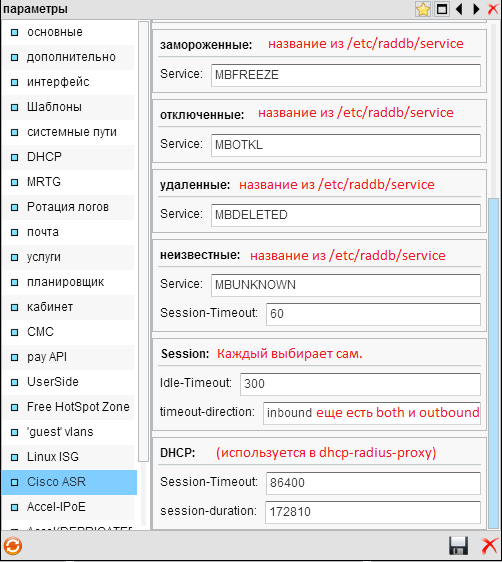hostname CiscoASR ! aaa new-model ! aaa group server radius ISG_SRV_GROUP server ип_биллинга auth-port 1812 acct-port 1813 ip radius source-interface Loopback1 – коннектимся на биллинг из под лупбека.Из за того что эта же ЦИска паралельно еще и pppoe сервером(другой тип NAS в Микбилле) является, в других тупых сегментах сети. ! aaa group server radius ISG_SERVICE_SRV_GROUP –сервер група для авторизации сервисов MBNOMONEY и тд server ип_биллинга auth-port 1912 acct-port 1913 ip radius source-interface Loopback1 ! aaa authentication login default local aaa authorization network ISG_AUTH_LIST group ISG_SRV_GROUP aaa authorization subscriber-service default group ISG_SERVICE_SRV_GROUP aaa accounting delay-start all aaa accounting jitter maximum 0 aaa accounting update periodic 5 aaa accounting network ISG_ACCT_LIST start-stop group ISG_SRV_GROUP ! aaa server radius proxy ! aaa server radius dynamic-author client ип_биллинга server-key 7 070B2848 – хосты которые COA будут слать на ASR (биллинг,возможно у кого-то еще и портал) client ип_портала server-key 7 050F820B server-key 7 070B2848 port 3799 auth-type any ! aaa session-id common clock timezone Moscow 3 0 ! ip dhcp database flash:my-dhcp-database – ВАЖНО.при ребуте циски.dhcp_bindings от сюда подтянет. Можно на tftp хранить ip dhcp relay information trust-all no ip dhcp ping packets -внимательно читать доку. Тут каждый сам решает.У меня часто в конфликт уходили адреса. Просто отключили проверку и все ! ip dhcp pool MIKBILL – это способ выдачи адресов через dhcp-radius-proxy authorization method ISG_AUTH_LIST authorization shared-password radiuspassword authorization username %c *82опция AVпарой пойдет в access-requeste ! subscriber templating subscriber authorization enable ! multilink bundle-name authenticated ! class-map type control match-all COND_LAST match timer 2MIN match authen-status unauthenticated ! policy-map type control IPOE_CUSTOMERS class type control COND_LAST event timed-policy-expiry 10 service disconnect ! class type control always event session-start 10 authorize aaa list ISG_AUTH_LIST password radiuspassword identifier source-ip-address 20 set-timer 2MIN 2 ! class type control always event account-logoff 10 service disconnect ! interface Loopback1 ip address a.b.c.e 255.255.255.0 secondary (a.b.c.e – является шлюзом в пуле реальников/24) ip address 172.16.0.1 255.255.0.0 ! interface TenGigabitEthernet0/0/0.556 –“LAN” в сторону абонентов encapsulation dot1Q 556 second-dot1q 101-300 ip unnumbered Loopback1 ip helper-address ип_биллинга (если выдача dhcp клиенту НЕ через dhcp-radius-proxy) ip nat inside – если абонам серые адреса выдаются service-policy type control IPOE_CUSTOMERS ip subscriber routed initiator unclassified ip-address ipv4 ! interface TenGigabitEthernet0/0/1 -“WAN” в сторону bgp бордера encapsulation dot1Q 111 ip address хх.хх.хх.хх 255.255.255.252 ip nat outside access-list 110 permit tcp 172.16.0.0 0.0.255.255 any eq www – 172.16.0.0/16 это серые ип юзеров access-list 130 permit tcp any host ip_billinga access-list 130 permit tcp any host ip_kabineta access-list 130 permit tcp any host ip_websita access-list 130 permit tcp host ip_billinga any access-list 130 permit tcp host ip_kabineta any access-list 130 permit tcp host ip_websita any ! radius-server attribute 44 include-in-access-req default-vrf no radius-server attribute 77 include-in-acct-req no radius-server attribute 77 include-in-access-req radius-server attribute 8 include-in-access-req radius-server attribute nas-port format e VVVVVVVVVVVVVVVVQQQQQQQQQQQQQQQQ-не обязательно именно так. radius-server attribute 31 mac format unformatted radius-server host ип_биллинга auth-port 1812 acct-port 1813 radius-server host ип_биллинга auth-port 1912 acct-port 1913 radius-server key 7 045FEE02 radius-server vsa send cisco-nas-port radius-server unique-ident 5 ! ! end