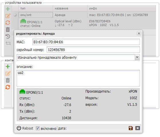 Теперь при открытии карты абонента, если у него будет добавлено устройство с типом ONU/ONT и заполненными полями, билинг будет искать информацию в MBP.