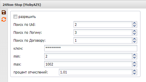 Указываем Ключ который занесен в процессинг 24 "Non-stop" Указываем процент отчислений, это необходимо для отчетности.