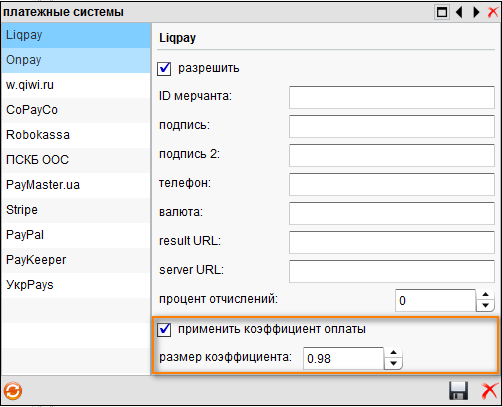 Переходим в настройки платежной системы. Включаем "применить коэффициент оплаты", затем выставляем значение "размер коэффициента"