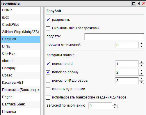 Для активации на стороне MikBiLL Вам необходимо в системных опциях Терминалы → EasySoft включить опцию "связать с дилерами" и указать "дилера по умолчанию".