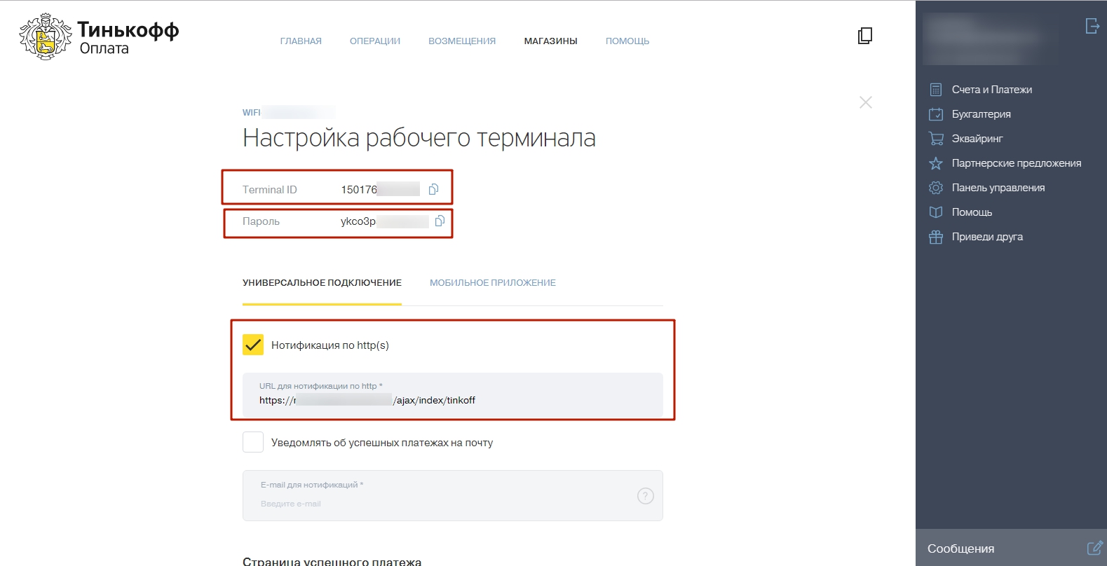 - URL для нотификации по http - вводим ссылку в формате https://admin.ispnet.demo/ajax/index/tinkoff