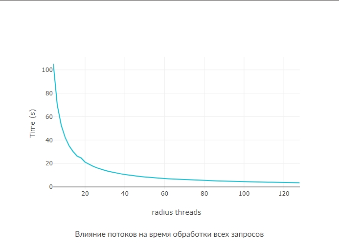 Как видно на графике, повышение кол-ва потоков увеличивает производительность и сокращается время требуемое на обработки всех запросов