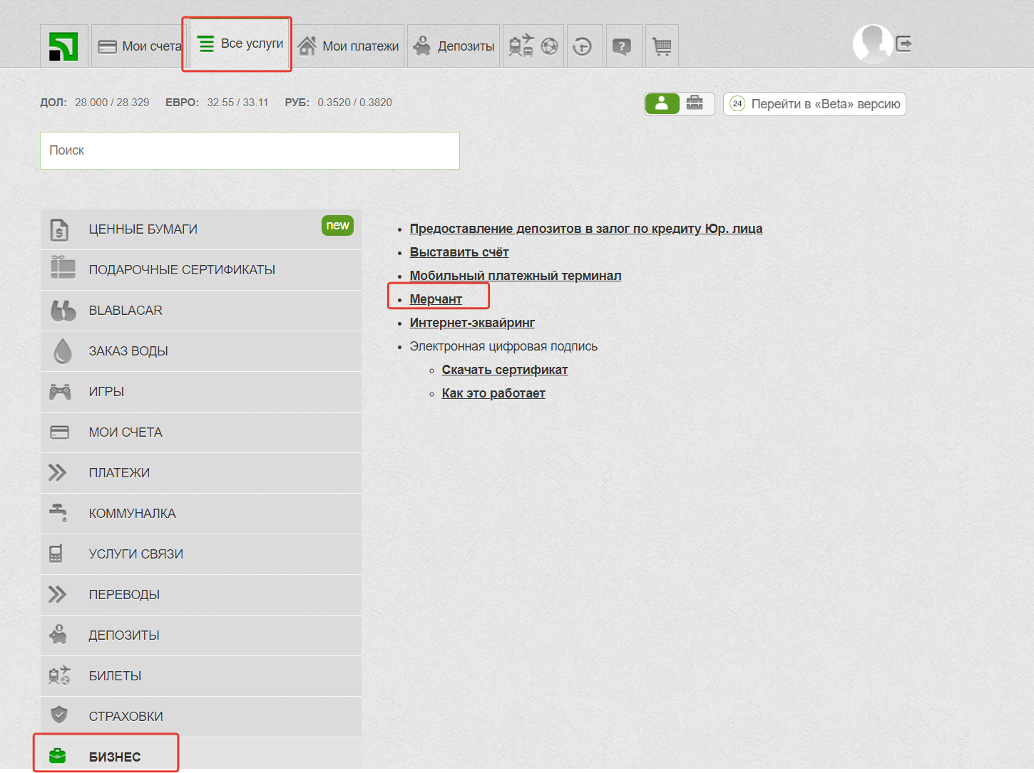 3. Переходим в меню “Все услуги” ⇒ “Бизнес” ⇒ “Мерчант”