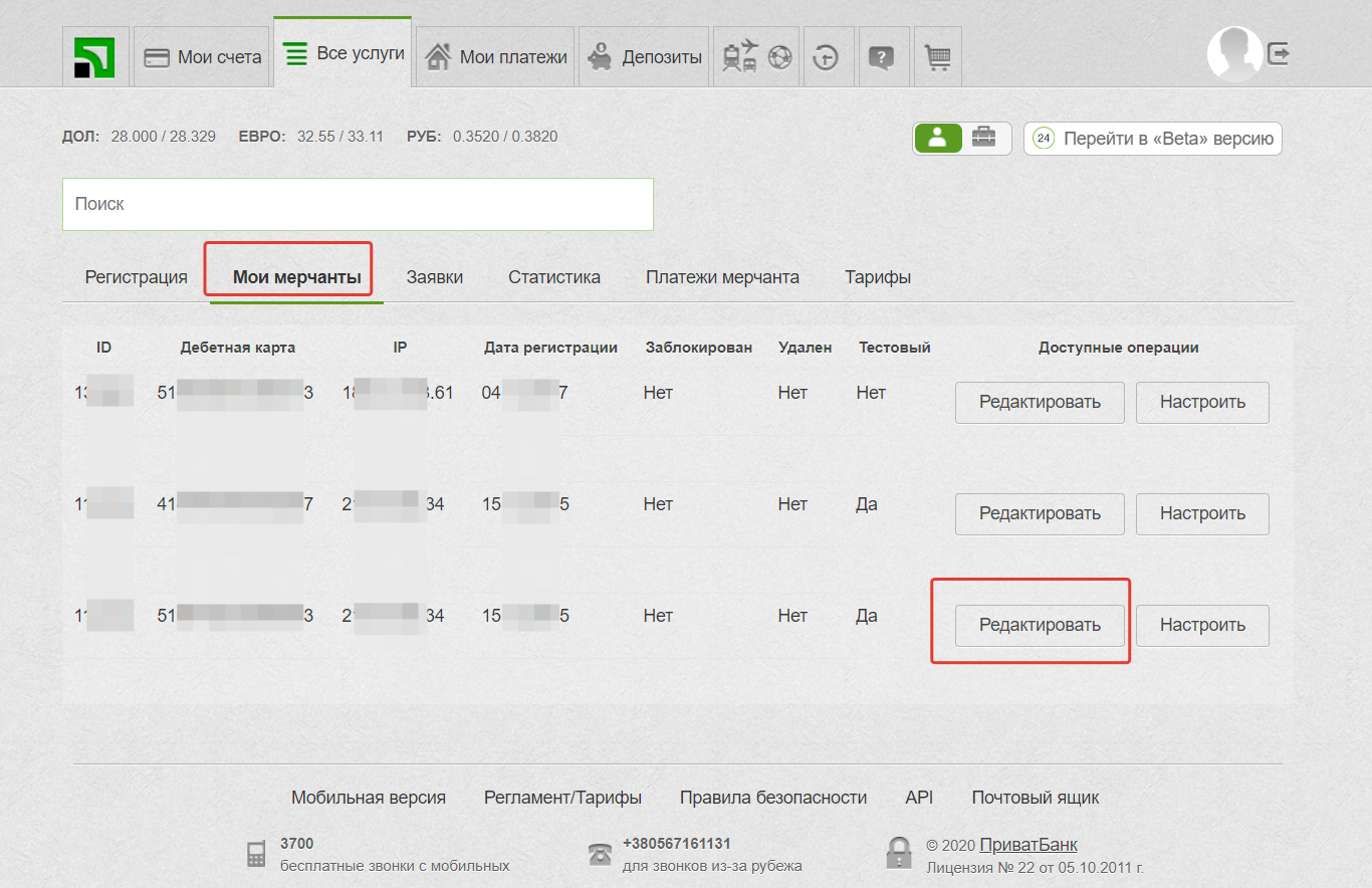 4. Переходим во вкладку “Мои мерчанты”, выбираем мерчант и нажимаем “Редактировать” (поочередно повторить со всеми активными мерчантами в данной вкладке)