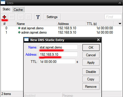 DNS static Бывают часто ситуации, когда необходимо внести статические записи DNS в микротике, чтобы к примеру, клиенты могли попасть в личный кабинет. Это делается следующим образом: Откройте IP-DNS, нажмите «+» Name – DNS имя ресурса Address – ip адрес ресурса