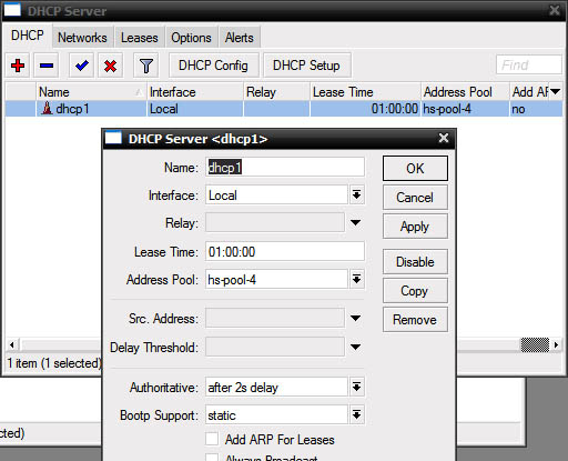 В итоге мы получили настроеный DHCP, который слушает на клиентском интерфейсе и использует заданный в визарде пул адресов, на скринах это видно: