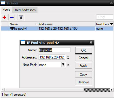 Таже мы получили непосредственно сам хотспот, который слушает на клиентском интерфейсе, использует заданный пул адресов. Дополнительно в настройках надо указать Profile (его вы поменяете под свои нужды, в зависимоти от типа авторизаци), Idle Timeout – отключение клиента после простоя (по необходимости):