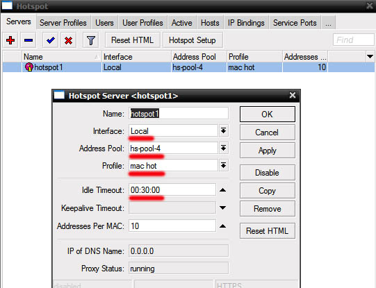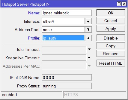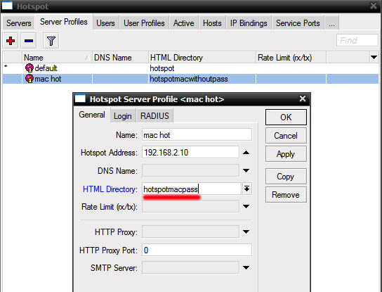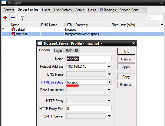 Откройте IP-Hotspot-Server Profiles закладка General. Hotspot Address – адрес интерфейса, на котором работает хотспот HTML Directory – здесь выбираете профиль, для авторизации по mac «hotspot»