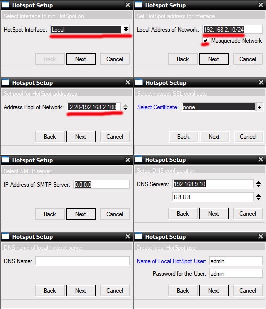Теперь, когда у вас настроена авторизация между биллингом и NAS, настроены опции и тип Radius, NTP клиент, DNS и прочее в Mикротике, время приступать к настройке Hotspot. В нашем примере, для клиентов подсеть 192.168.2.0/24, для биллинга подсеть 192.168.9.0/24.