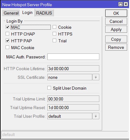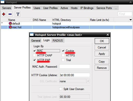 Откройте IP-Hotspot-Server Profiles закладка Login. Отметьте чекбокс HTTP PAP. Cookie – по желанию, для удобства клиента браузер будет хранить cookie.