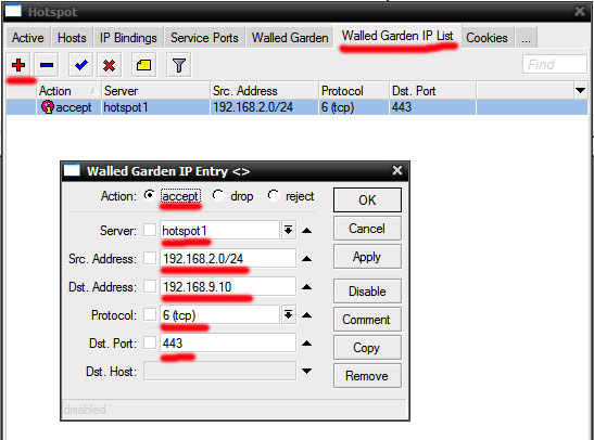Откройте IP-Hotspot-Walled Garden IP List. Нажмите «+». Action – действие, выберем «accept» Server – укажем наш хотспот сервер Src. Address – адрес источника, укажем нашу подсеть с клиентами Dst. Address – ip адрес ресурса, к которому даем доступ Protocol – протокол, по необходимости Dst. Port – порт назначения, по необходимости