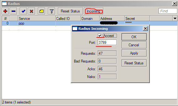 После добавления сервера настром входящие соединения от Radius. Нажмем на "Incoming". Включим службу и укажим порт, после версии 3.22 порт стал не 1700 а 3799. По умолчанию в биллинге указан порт 3799. В соотвествии с этим в настройках NAS-сервера в "админке" биллинга укажите тот же самый порт.