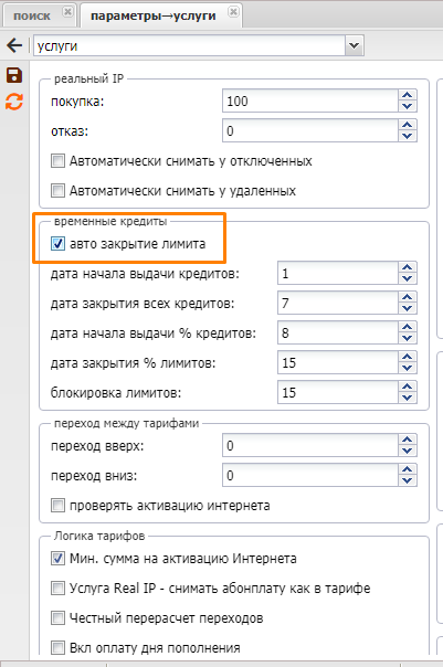 Кредиты необходимы для предоставления пользователям возможности получать услуги после окончания оплаченного периода. Мы можем задать некий период, к примеру 7 дней, для того чтобы пользователь мог за это время оплатить услуги и, без дискомфорта, продолжал пользоваться интернетом. Базовые настройки кредита находятся в системных опциях: