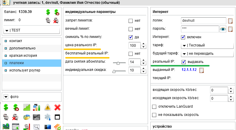 Также можно указать абоненту индивидуальную оплату за услугу "Real IP" или сделать её бесплатной для конкретного абонента.
