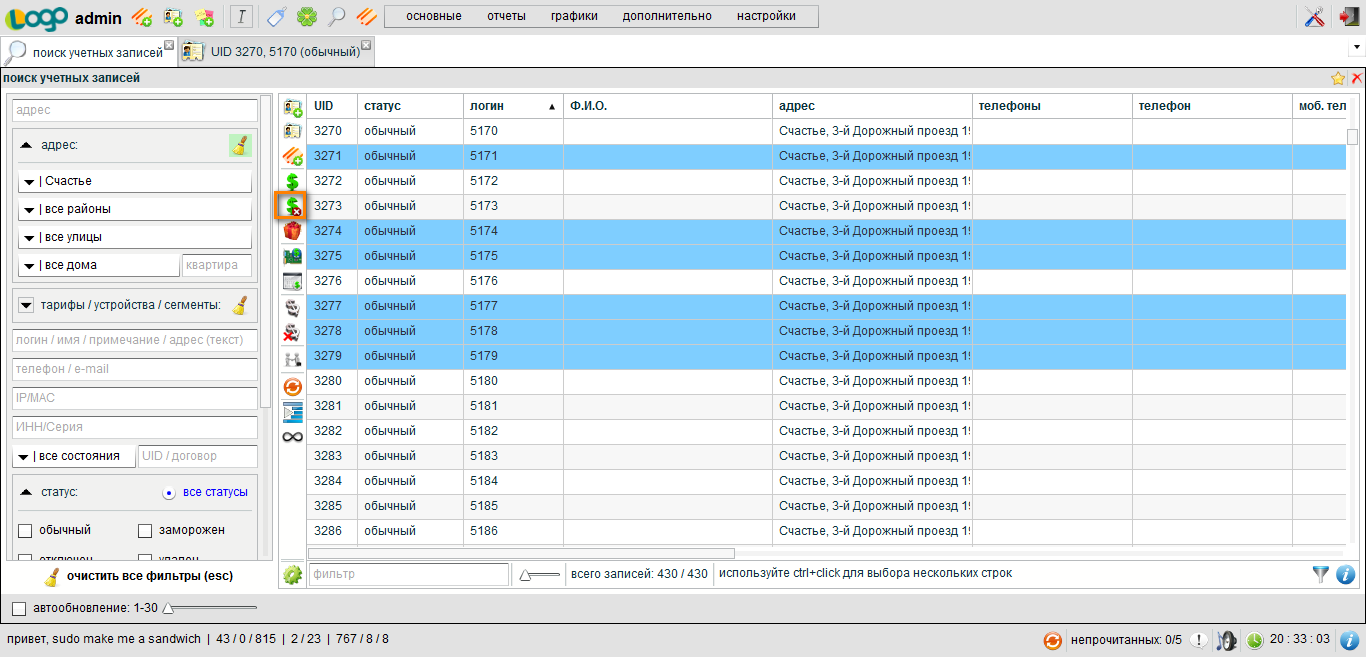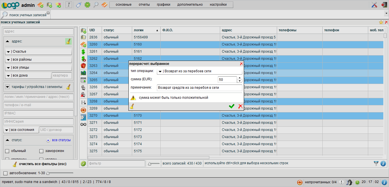 1. Выделяем группу абонентов из таблицы для мультидействия. Для выборочного выделения нажимаем клавишу CTRL + клик левой клавишей мышки, также можно использовать боковой фильтр слева для фильтрации абонентов по различный критериям, к примеру населенный пункт г.Счастье. Потом выбираем желаемое действие(в нашем случае это перерасчет)