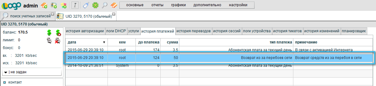 3. В истории платежей у выбранной группы абонентов, в карточке абонента появилась запись о возврате средств