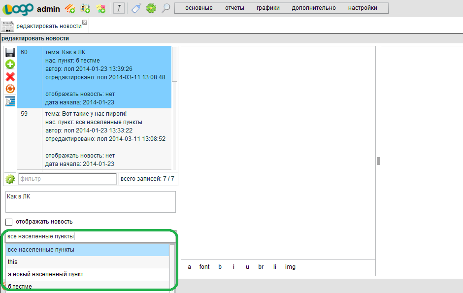 В админ. панели в разделе редактор новостей для Личного Кабинета (ЛК) можно указать один город, в котором будут отображаться новости.