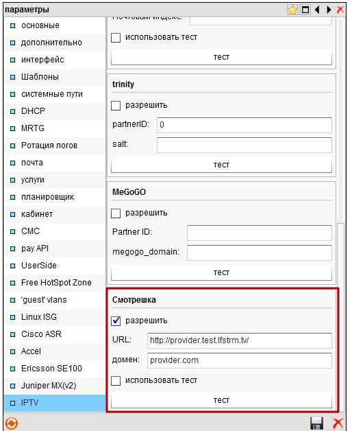 - Указываем параметры URL в формате: http://provider.test.lfstrm.tv/