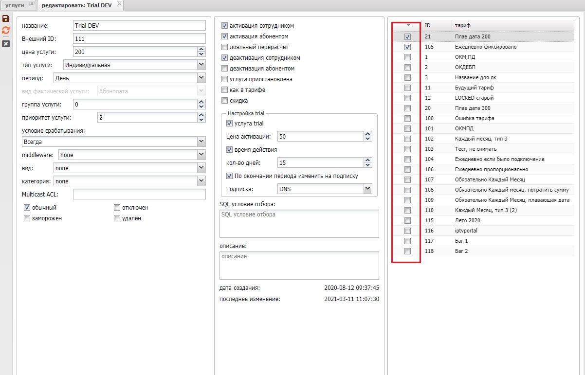 - Услуга приостановлена - на время отключает услугу из списка для выбора без её удаления и открепления от тарифов (так же останавливается снятие АП по подписке)