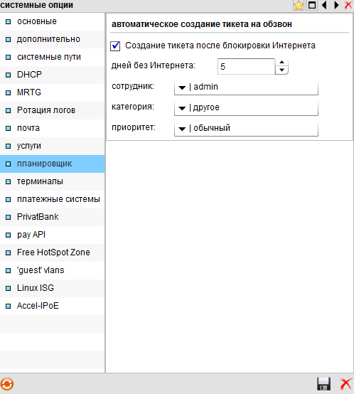- "дней без Интернета" - количество дней, которое должно пройти с момента блокировки Интернета системой для создания тикета