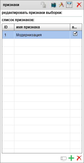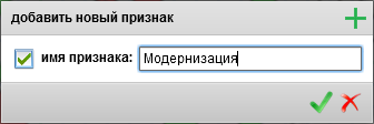 После подтверждения будет создан признак с заданным именем, который будет доступен всем дочерним и зависимым объектам и выборкам. Имя признака можно изменить кликнув на него в списке два раза, либо нажав кнопку "Редактирование". Удалить признак можно нажав кнопку "Удалить признак".