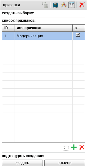 Функционал набора инструментов для работы с признаками универсальный как для выборки, так и для объектов и меню создания выборки в карте.